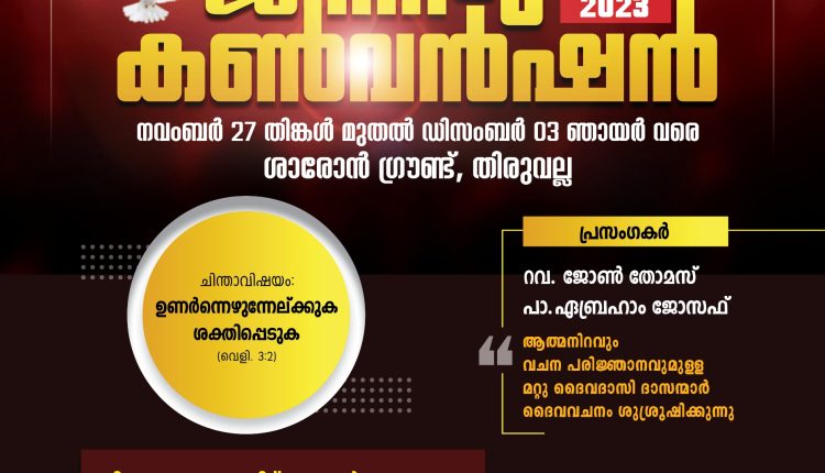 തിരുവല്ല: ശാരോൻ ഫെലോഷിപ്പ് ചർച്ച് ജനറൽ കൺവൻഷൻ നവംബർ 27 തിങ്കൾ മുതൽ ഡിസംബർ 3 ഞായർ വരെ തിരുവല്ല ശാരോൻ കൺവൻഷൻ ഗ്രൗണ്ടിൽ നടക്കും. “ഉണർന്നെഴുന്നേല്ക്കുക, ശക്തിപ്പെടുക” (വെളിപ്പാട് 3:2) എന്നതാണ് കൺവൻഷൻ തീം.