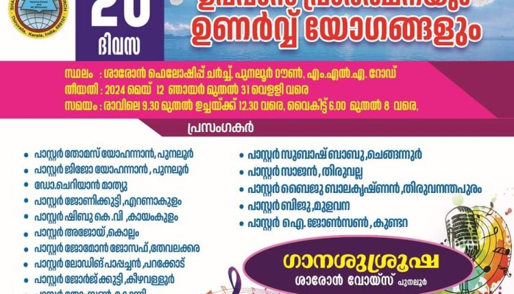 പുനലൂർ: പുനലൂർ ടൗണിൽ എം എൽ എ റോഡിലുള്ള ശാരോൺ ഫെലോഷിപ് ചർച്ചിൽ മെയ് 12 മുതൽ മെയ് 31 വെള്ളി വരെ 21 ദിവസത്തെ ഉപവാസ പ്രാർത്ഥന നടക്കും . എല്ലാ ദിവസവും രാവിലെ ഒമ്പതരക്കും വൈകിട്ട് ആറരക്കും പ്രാർത്ഥനകൾ ആരംഭിക്കും.