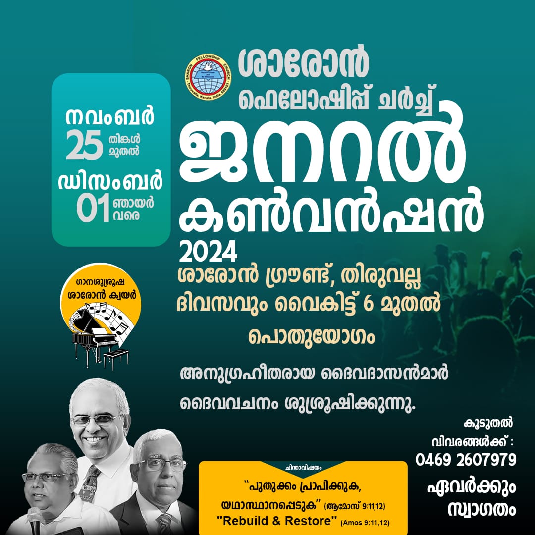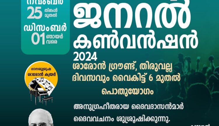 തിരുവല്ല: ശാരോൻ ഫെലോഷിപ്പ് ചർച്ചിൻ്റെ ഈ വർഷത്തെ ജനറൽ കൺവൻഷൻ നാളെ മുതൽ ഡിസംബർ 1 ഞായർ വരെ തിരുവല്ല ശാരോൻ കൺവൻഷൻ ഗ്രൗണ്ടിൽ നടക്കും. ” പുതുക്കം പ്രാപിക്കുക, യഥാസ്ഥാനപ്പെടുക”