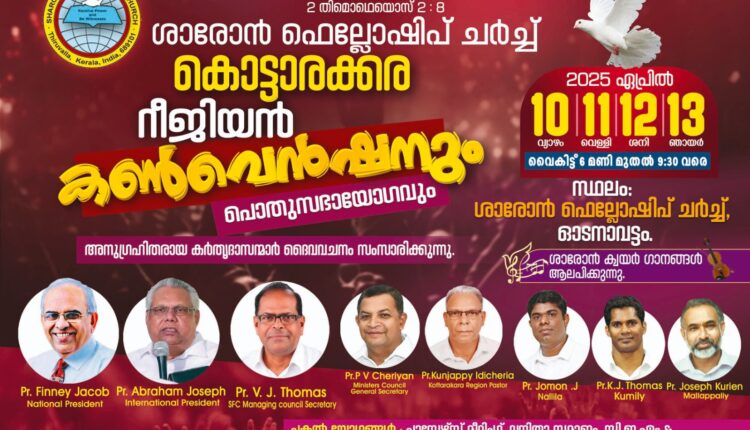 ഓടനാവട്ടം : ശാരോൻ ഫെല്ലോഷിപ്പ് സഭകളുടെ കൊട്ടാരക്കര റീജിയൻ കൺവെൻഷൻ 2025 ഏപ്രിൽ 10 മുതൽ 13 വരെ ഓടനാവട്ടം ചർച്ച് ഗ്രൗണ്ടിൽ നടത്തപ്പെടുകയാണ്. പത്താം തിയതി വൈകിട്ട് റീജിയൻ പാസ്റ്റർ കുഞ്ഞപ്പി ഇടിച്ചെറിയ ഉദ്ഘാടനം ചെയ്യുകയും, പാസ്റ്റർ ജോമോൻ ജെ, പാസ്റ്റർ കെ. ജെ തോമസ് കുമളി, പാസ്റ്റർ ജോസഫ് കുര്യൻ എന്നീ കർത്തൃദാസൻമാർ തുടർന്നുള്ള ദിവസങ്ങളിൽ ദൈവവചനത്തിൽ നിന്ന് ശുശ്രൂഷിക്കുന്നതുമാണ്. ഞായറാഴ്ച്ച പകൽ പൊതുസഭായോഗത്തോടും, തിരുമേശയോടും സമാപിക്കുന്ന കൺവെൻഷനിൽ ശാരോൻ ഫെലോഷിപ്പ് ചർച്ച് ഇന്റർനാഷണൽ പ്രസിഡന്റ് പാസ്റ്റർ എബ്രഹാം ജോസഫും മിനിസ്റ്റേഴ്സ് കൗൺസിൽ ജനറൽ സെക്രട്ടറി