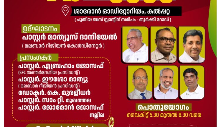 വയനാട്: ശാരോൻ ഫെലോഷിപ്പ് ചർച്ച് മലബാർ റീജിയൺ കൺവെൻഷൻ ഏപ്രിൽ 24 വ്യാഴംമുതൽ 27 ഞായർ വരെ കൽപ്പറ്റ ശാരോൻ ഓഡിറ്റോറിയത്തിൽ നടക്കും. വ്യാഴം വൈകിട്ട് ആറിന് ഉദ്ഘാടന സമ്മേളനവും വെള്ളിയാഴ്ച പാസ്റ്റേഴ്സ് ഫാമിലി കോൺഫറൻസും ശനിയാഴ്ച രാവിലെ വനിതാ സമ്മേളനവും ഉച്ചകഴിഞ്ഞ് സി.ഇ.എം.- സണ്ടേസ്കൂൾ സംയുക്ത സമ്മേളനവും നടക്കും. ഞായറാഴ്ച പൊതുസഭായോഗത്തോടും കർത്തൃമേശയോടും കൂടെ സമാപിക്കും.