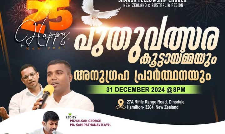 ന്യൂസിലാൻഡ് : ഷാരോൺ ഫെലോഷിപ്പ് ചർച്ച് ന്യൂസിലാൻഡ് & ഓസ്ട്രേലിയ റീജിയന്റെ ആഭിമുഖ്യത്തിൽ ഡിസംബർ 31 ന് ന്യൂസിലാൻഡിൽ പുതുവത്സര കൂട്ടായ്മയും അനുഗ്രഹ പ്രാർത്ഥനയും നടക്കും. പാ. വത്സൻ ജോർജ്, പാ. സാം പത്തനാവിളയിൽ എന്നിവർ നേതൃത്വം നൽകും. ബ്രദർ ജേക്കബ് ജോർജ് & ഷാരോൺ ഗായകസംഘം ഗാന ശുശ്രൂഷ നിർവഹിക്കും.