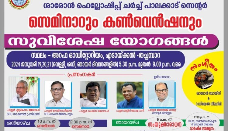 പാലക്കാട്. ശാരോൻ ഫെലോഷിപ്പ് പാലക്കാട് സെൻറ്റർ കൺവെൻഷൻ ജനു.19 മുതൽ 21വരെ തച്ചമ്പാറ എടായ്ക്കൽ അറഫ ഓഡിറ്റോറിയത്തിൽ നടക്കും. സെൻറർ മിനിസ്റ്റർ ജോർജ് മാത്യു ഉൽഘാടനം ചെയ്യും. പാസ്റ്റർ എബ്രഹാം ജോസഫ് , പാസ്റ്റർ റോയി ചെറിയാൻ , പാസ്റ്റർ ചെയ്സ് ജോസഫ് , പാസ്റ്റർ വർഗ്ഗീസ് ജോഷ്വ റാന്നി എന്നിവർ മുഖ്യ സന്ദേശം നൽകും.