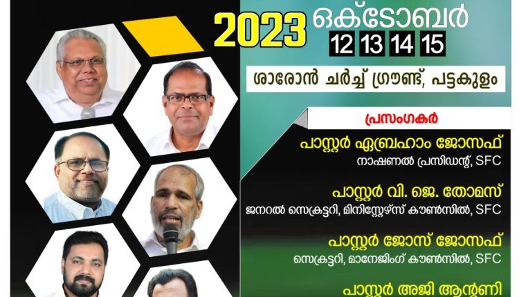 തിരുവനന്തപുരം : ശാരോൻ ഫെലോഷിപ്പ് ചർച്ച് തിരുവനന്തപുരം റീജിയൻ കൺവൻഷൻ നടക്കുന്നു. പട്ടക്കുളം ശാരോൻ ഗ്രൗണ്ടിൽ വച്ച് ഒക്ടോബർ 12 മുതൽ 15 വരെയാണ് . പാസ്റ്റർമാരായ ഏബ്രഹാം ജോസഫ്, വി.ജെ.തോമസ്, ജോസ് ജോസഫ്, സാം.റ്റി. മുഖത്തല, അജി ആന്റണി, വർഗ്ഗീസ് ജോഷ്വ എന്നിവർ പ്രസംഗിക്കും. ശാരോൻ ക്വയർ ഗാനങ്ങൾ ആലപിക്കും. ഞാറാഴ്ച രാവിലെ 9 മണി മുതൽ സംയുക്ത സഭായോഗം ഉണ്ടായിരിക്കുന്നതാണ്.