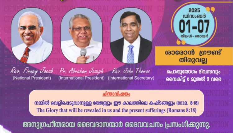 തിരുവല്ല: ശാരോൻ ഫെലോഷിപ്പ് ചർച്ചിൻ്റെ ഈ വർഷത്തെ ജനറൽ കൺവൻഷൻ ഡിസംബർ 1 തിങ്കൾ മുതൽ 7 ഞായർ വരെ തിരുവല്ല ശാരോൻ കൺവൻഷൻ ഗ്രൗണ്ടിൽ വച്ച് നടക്കും. ‘നമ്മിൽ വെളിപ്പെടുവാനുള്ള തേജസ്സും ഇക്കാലങ്ങളിലെ കഷ്ടതയും’