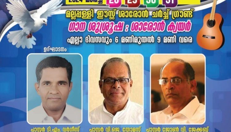 മല്ലപ്പള്ളി: ശാരോൻ ഫെലോഷിപ്പ് മല്ലപ്പള്ളി സെന്റർ കൺവൻഷൻ മാർച്ച് 28 മുതൽ 31 വരെ മല്ലപ്പള്ളി ഈസ്റ്റ് ഗ്രൗണ്ടിൽ നടക്കും. സെന്റർ സെക്രട്ടറി പാസ്റ്റർ ടി.എം വർഗീസ് ഉത്ഘാടനം നിർവഹിക്കും. പാസ്റ്റർ വി. ജെ തോമസ്കുട്ടി (മിനിസ്റ്റേഴ്സ് കൗൺസിൽ ജനറൽ സെക്രട്ടറി ) , പാസ്റ്റർ ജോൺ വി ജേക്കബ് ( മല്ലപ്പള്ളി റീജിയൻ പാസ്റ്റർ ) , പാസ്റ്റർ ജോസഫ് കുരൃൻ ( മല്ലപ്പള്ളി സെന്റർ മിനിസ്റ്റർ ) ,പാസ്റ്റർ പോൾ ഗോപാലകൃഷ്ണൻ , പാസ്റ്റർ ജോയി പാറക്കൽ തുടങ്ങിയവർ പ്രസംഗിക്കും.