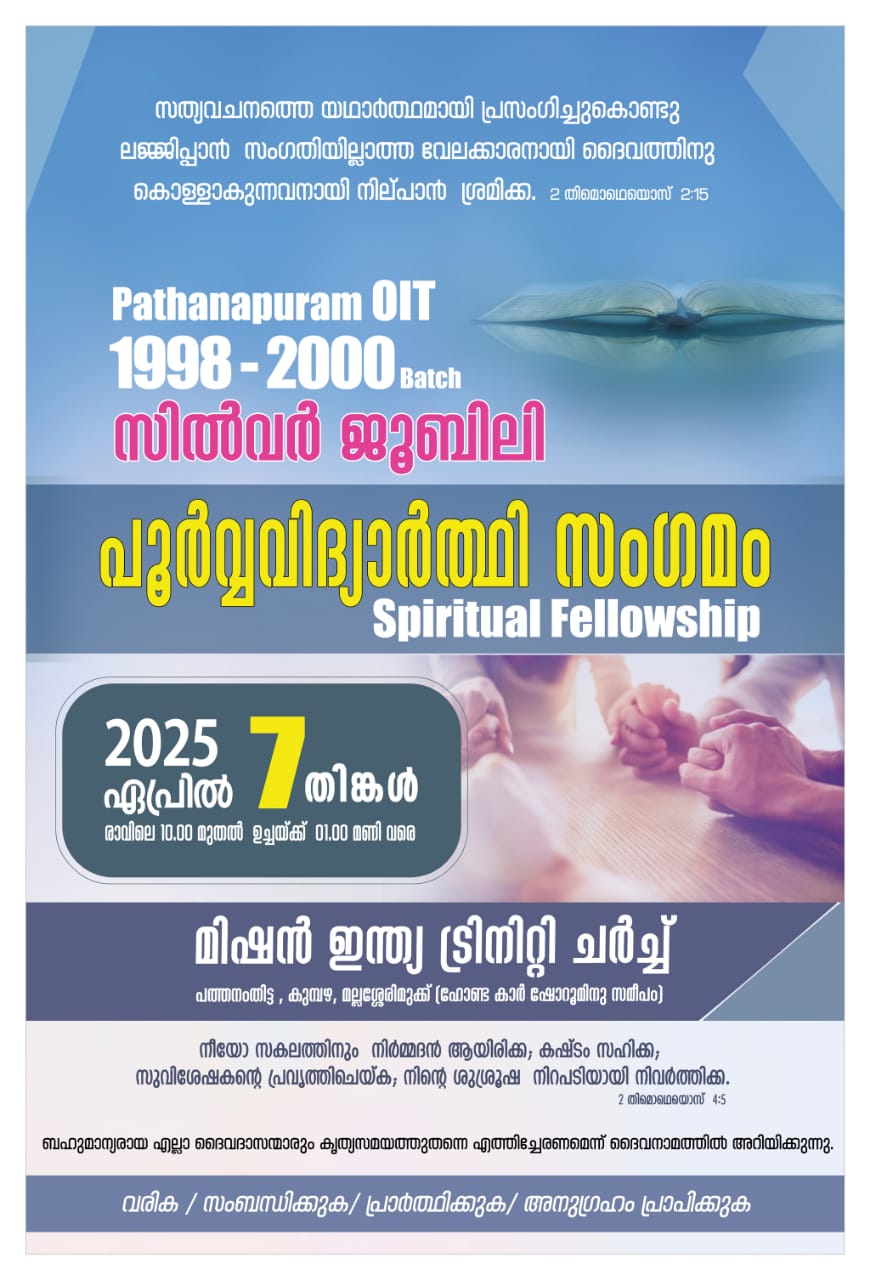 പത്തനംതിട്ട : 25 – വർഷങ്ങൾക്ക് മുൻപ് പത്തനാപുരം ഒ ഐ ടി 1998 – 2000 ബാച്ചിൽ ഒരുമിച്ച് വേദപഠനം നടത്തിയ ദൈവദാസന്മാർ ഏപ്രിൽ 07 തിങ്കളാഴ്ച കുമ്പഴ മല്ലശ്ശേരി മുക്ക് മിഷൻ ഇന്ത്യ ട്രിനിറ്റി ചർച്ച് ഹാളിൽ ആത്മിയ കൂട്ടായ്മ നടത്തും. പാ. ബിനോജ് ഊന്നുകൽ ശുശ്രൂഷകൾക്ക് നേതൃത്വം വഹിക്കും. വിവിധ സ്റ്റേറ്റുകളിൽ നിന്നും ദൈവദാസന്മാർ പങ്കെടുക്കും എന്ന് പാ. സജു കെ കെ, പാ. തോമസ് എം സി, പാ. സിജു തുടങ്ങിയവർ അറിയിച്ചു.