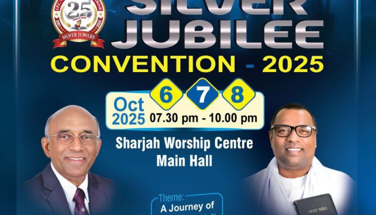 ഷാർജ: ഐ.പി.സി വർഷിപ്പ് സെന്റർ ഷാർജ സഭയുടെ ആഭിമുഖ്യത്തിൽ സിൽവർ ജൂബിലി ത്രിദിന കൺവൻഷൻ ഒക്ടോബർ 6 മുതൽ 8 വരെ നടക്കും. ദിവസവും വൈകിട്ട് 7.30-ന് ആരംഭിക്കുന്ന കൺവൻഷനിൽ പാസ്റ്റർ അനീഷ് കാവാലം മുഖ്യ പ്രഭാഷണം നടത്തും.