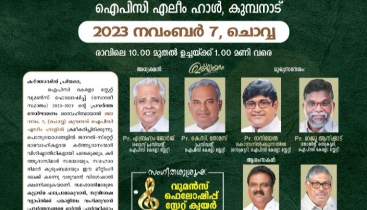 കുമ്പനാട്: ഐപിസി കേരള സ്റ്റേറ്റ് സോദരി സമാജം 2023 – 2027 ഭരണസമിതിയുടെ പ്രവർത്തന ഉദ്ഘാടനം നവംബർ 7 നാളെ കുമ്പനാട് ഐപിസി ഹാളിൽ നടക്കും. പാസ്റ്റർ എബ്രഹാം ജോർജ് അധ്യക്ഷത വഹിക്കും. പാസ്റ്റർ കെ.സി തോമസ് ഉദ്ഘാടനം ചെയ്യും. മുഖ്യസന്ദേശം പാസ്റ്റർ ദാനിയേൽ കൊന്നതിൽകുന്നേൽ, പാസ്റ്റർ രാജു ആനിക്കാട് എന്നിവർ നൽകും. ജയിംസ് ജോർജ് വേങ്ങൂർ, പി.എം ഫിലിപ്പ് എന്നിവർ ആശംസകൾ അറിയിക്കും. വുമൺസ് ഫെല്ലോഷിപ്പ് സ്റ്റേറ്റ് ക്വയർ ഗാനങ്ങൾ ആലപിക്കും. സഹോദരി സമാജം ഭാരവാഹികളായ ആനി ജോർജ്, ആലീസ് ജോൺ റിച്ചാർഡ്, ഗീതമ്മ സ്റ്റീഫൻ, ജയ്മോൾ രാജു, ലിസി വർഗീസ്, സൂസൻ ജോൺ, ജോയമ്മ ബേബി എന്നിവർ നേതൃത്വം നൽകും.
