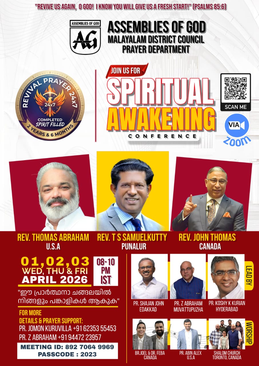 എ.ജി. മലയാളം ഡിസ്ട്രിക്ട് പ്രയർ ഡിപ്പാർട്ട്മെൻ്റ് നേതൃത്വം നല്കുന്ന തുടർമാന ഓൺലൈൻ പ്രാർത്ഥനയായ റിവൈവൽ പ്രയർ തുടർച്ചയായ മുപ്പത് മാസം പിന്നിടുന്നു.