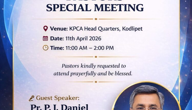 യോഗത്തിൽ മുഖ്യാതിഥിയായി കോയമ്പത്തൂരിൽ നിന്നുള്ള പാസ്റ്റർ പി. ജെ. ഡാനിയൽ പങ്കെടുക്കുകയും ദൈവവചനം പങ്കുവെക്കുകയും ചെയ്യും. ഈ സംഗമം ശുശ്രൂഷകരുടെ ആത്മീയ ഉണർവിനും, ശുശ്രൂഷയിലെ പുതുശക്തി നേടുന്നതിനും വഴിയൊരുക്കുമെന്ന് പ്രതീക്ഷിക്കുന്നു.