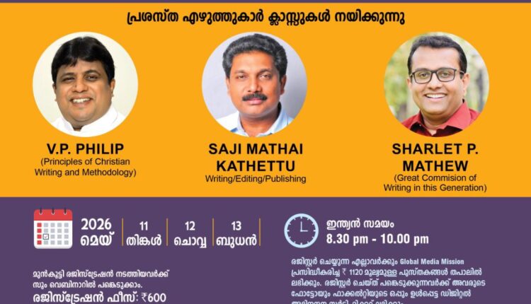 തിരുവല്ല: ഗ്ലോബൽ മീഡിയ മിഷൻ്റെ ആഭിമുഖ്യത്തിൽ 2026 മെയ് 11-13 വരെ നവ എഴുത്തുകാർക്കും ക്രിസ്തീയ രചനയിൽ സജീവമാകുവാൻ ആഗ്രഹിക്കുന്നവർക്കും പ്രത്യേകമായ രചന ശില്പശാല സംഘടിപ്പിക്കുന്നു. പ്രസിദ്ധ എഴുത്തുകരായ വി. പി. ഫിലിപ്പ്, സജി മത്തായി കാതേട്ട്, ഷാർലറ്റ് പി. മാത്യു എന്നിവർ ക്ലാസ്സുകൾ നയിക്കും. ക്രിസ്ത്യൻ പ്രിൻസിപ്പിൾസ് ഓഫ് റൈറ്റിങ്ങ് ആൻഡ് മെതഡോളജി, റൈറ്റിങ്ങ്,എഡിറ്റിങ്ങ് ആന്റ് പബ്ലിഷിങ്, റൈറ്റിങ്ങ് ഫോർ ന്യൂ ജെനറേഷൻ എന്നീ വിഷയങ്ങളിലാണ് ശില്പശാല നടക്കുന്നത്. എല്ലാ ദിവസവും വൈകിട്ട് 8.30-10.00 വരെ വെബിനാർ നടക്കും. മുൻകൂട്ടി രജിസ്ട്രേഷൻ നടത്തിയവർക്ക് സൂം വെബിനാറിൽ പങ്കെടുക്കാം.