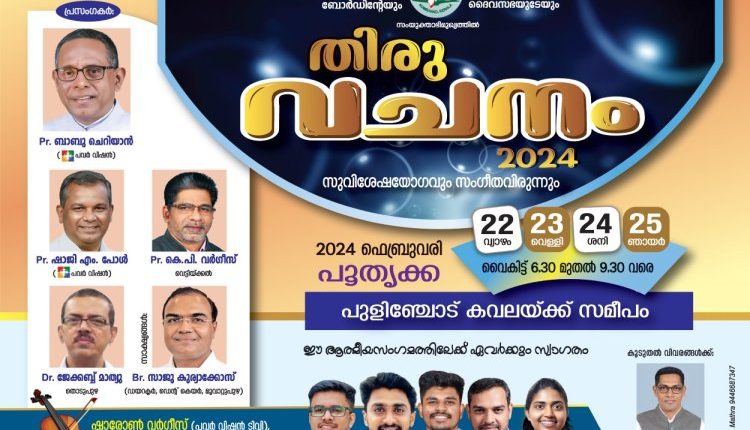 കോലഞ്ചേരി: ഐപിസി പിറവം സെന്റര് ഇവാഞ്ചിലിസം ബോര്ഡിന്റെയും പൂതൃക്ക ബേഥേല് പ്രയര് സെന്ററിന്റെയും സംയുക്താഭിമുഖ്യത്തില് പൂതൃക്ക പുളിഞ്ചോട് കവലയില് ഫെബ്രുവരി 22,23,24,25 തിയതികളില് വൈകിട്ട് 6.30 മുതല് സുവിശേഷ യോഗങ്ങള് നടക്കുന്നു. പാസ്റ്റർമാരായ ബാബു ചെറിയാന്, ഷാജി എം പോള്, കെ പി വര്ഗീസ്, ഡോ. ജേക്കബ് മാത്യു, സാജു കുര്യാക്കോസ് തുടങ്ങിയവര് പ്രസംഗിക്കും. ഷാരോണ് വര്ഗീസ്, ജോനാഥാന് ജോണ്, ജീസ്സണ് വെട്ടിയ്ക്കല്, തോമസ് ചെറിയാന്, അക്സ ക്രിസ്റ്റഫര് എന്നിവര് ഗാനശുശ്രൂഷ നയിക്കുന്നു.