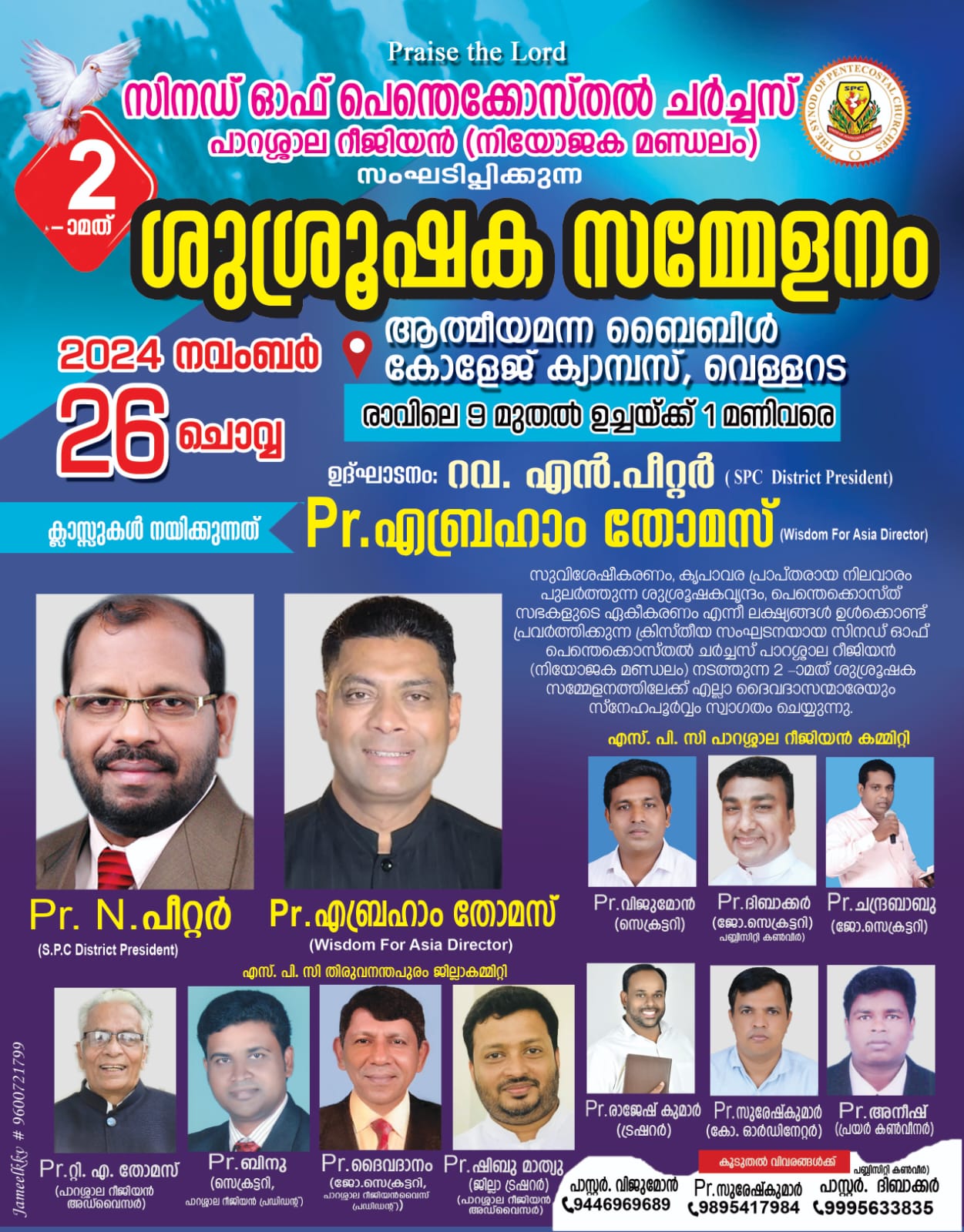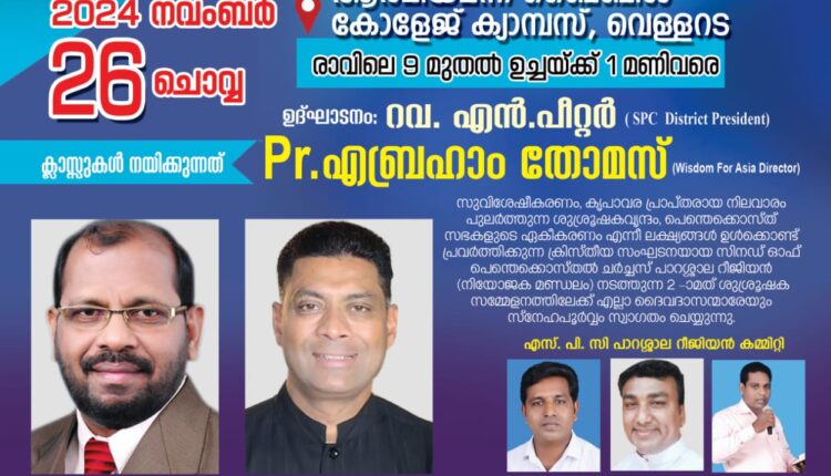 വെള്ളറട : സിനഡ് ഓഫ് പെന്തെക്കോസ്തൽ ചർച്ചസ് പാറശ്ശാല റീജിയന്റെ (നിയോജക മണ്ഡലം) ആഭിമുഖ്യത്തിൽ നാളെ (നവംബർ 26) വെള്ളറട ആത്മീയ മന്ന ബൈബിൾ കോളേജിൽ ശുശ്രൂഷക സമ്മേളനം നടക്കും. റവ. എൻ പീറ്റർ ഉദ്ഘാടനം നിർവഹിക്കും. പാ. എബ്രഹാം തോമസ് ക്ലാസ്സുകൾക്ക് നേതൃത്വം നൽകും.