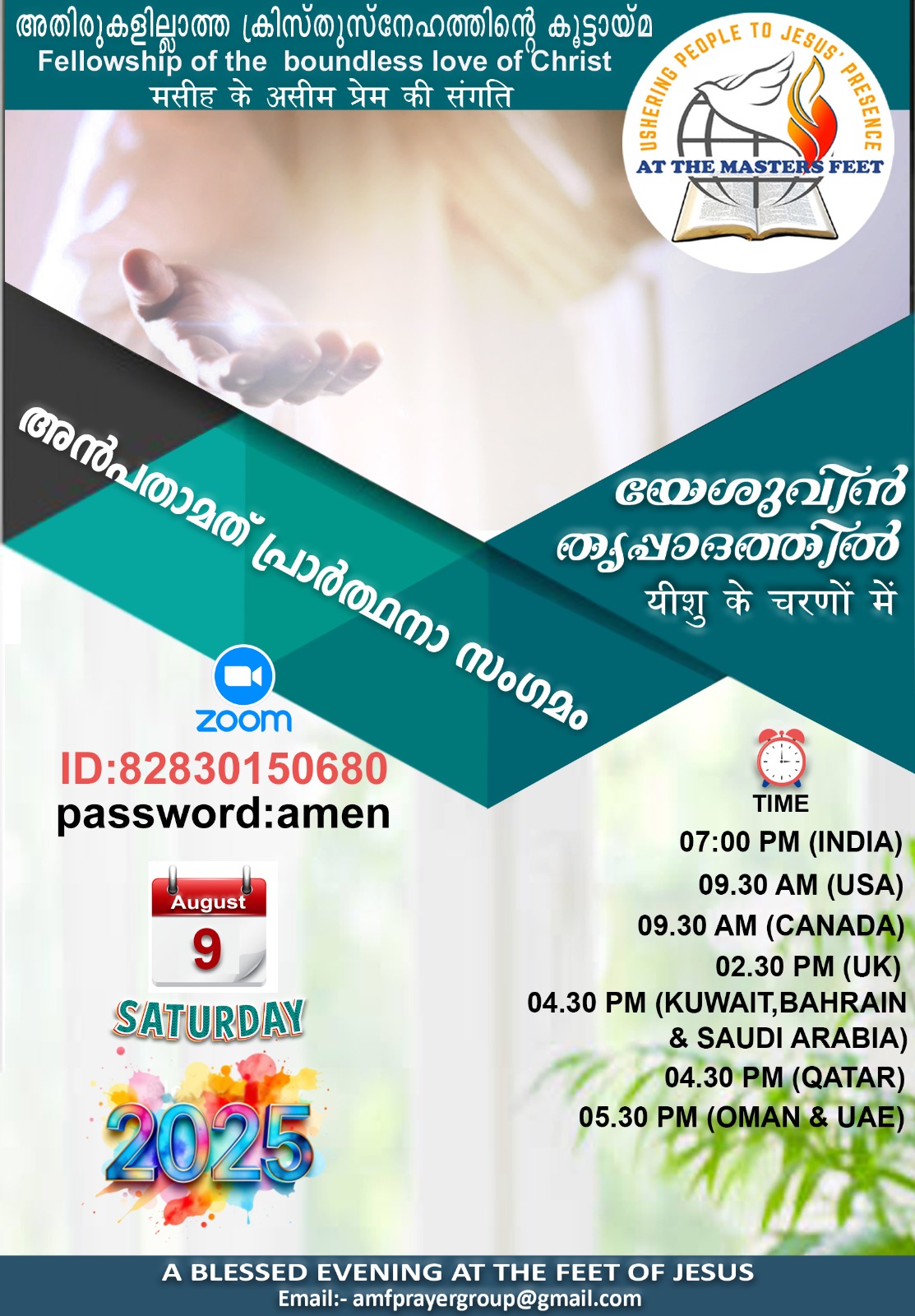 ദൈവവചനം അതിരുകളില്ലാതെ എല്ലാവരിലേക്കും എത്തിക്കുക എന്ന ലക്ഷ്യത്തോടെ സംഘടിപ്പിക്കുന്ന ”യേശുവിൻ തൃപ്പാദത്തിൽ” അൻപതാമത് പ്രാർത്ഥനാ സംഗമം ആഗസ്റ്റ് 9 ശനിയാഴ്ച  രാത്രി  7.00ന് (ഇന്ത്യൻ സമയം) ഓൺലൈനിൽ നടക്കും.