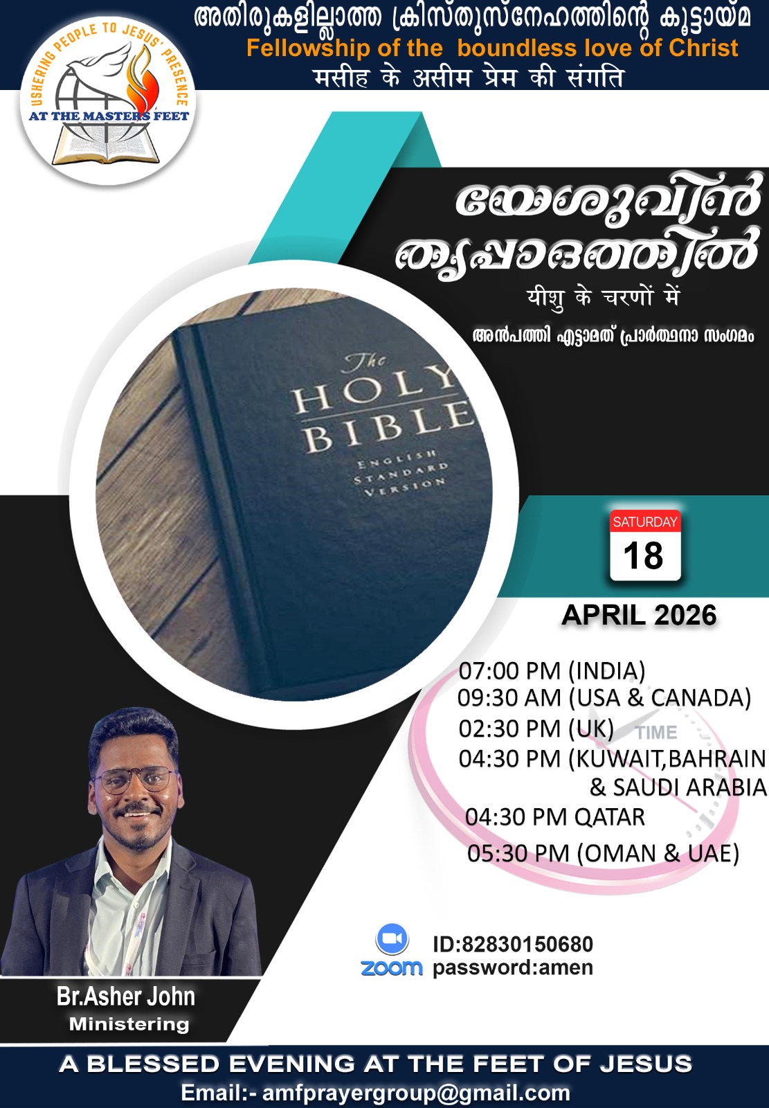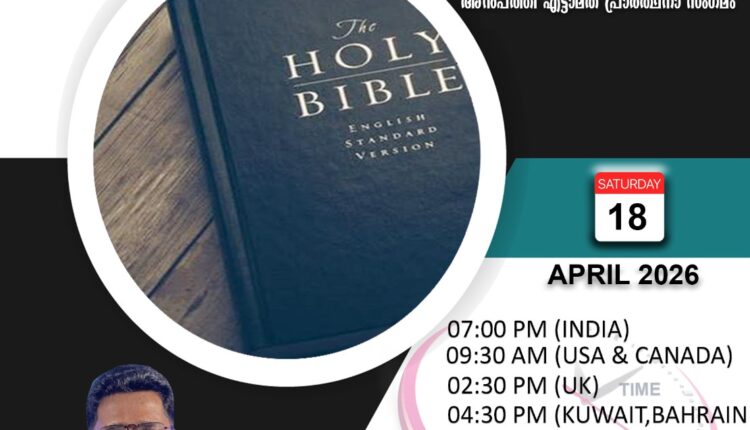 ദൈവവചനം അതിരുകളില്ലാതെ എല്ലാവരിലേക്കും എത്തിക്കുക എന്ന ലക്ഷ്യത്തോടെ സംഘടിപ്പിക്കുന്ന ”യേശുവിൻ തൃപ്പാദത്തിൽ” അൻപത്തി എട്ടാമത് പ്രാർത്ഥനാ സംഗമം ഏപ്രിൽ 18ന് ശനിയാഴ്ച രാത്രി 7.00ന് (ഇന്ത്യൻ സമയം) ഓൺലൈനിൽ നടക്കും. ക്രൈസ്തവ സംവാദ രംഗത്ത് ഈ കാലഘട്ടത്തിൽ ശക്തമായി ദൈവത്താൽ ഉപയോഗിക്കപ്പെടുന്ന Br. Asher John തൻറെ അനുഭവങ്ങളും മുഖ്യ സന്ദേശവും നൽകുന്നു. കൂടാതെ പ്രസിദ്ധ ക്രൈസ്തവ ഗായകനും ഗാന രചയിതാവുമായ ബ്രദർ ഷെറിൻ ബോസ് & ടീം ഖത്തർ നയിക്കുന്ന ഗാനശുശ്രൂഷയും ഉണ്ടായിരിക്കും. 2021 ജൂലൈ മുതൽ ആരംഭിച്ച യേശുവിൻ തൃപ്പാദത്തിൽ സൂം മീഡിയയിലൂടെ സംഘടിപ്പിച്ചുവരുന്നത്. മുടക്കം കൂടാതെ എല്ലാ മാസങ്ങളിലും നടന്നുവരുന്ന ഈ പ്രോഗ്രാമിലൂടെ ലോകമെമ്പാടുമുള്ള മലയാളികൾ ക്രിസ്തുവിനെ അറിയുവാൻ ഒരു മുഖാന്തിരമായി ഇതിന്റെ പ്രവർത്തനങ്ങൾ നടന്നു വരുന്നു. ID : 828 3015 0680 Password :amen