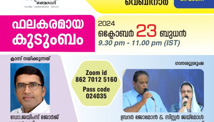 ഫലകരമായ കുടുംബം എന്നതാണ് ചിന്താവിഷയം. കുടുംബവും സമകാലിക സാഹചര്യവും ചർച്ചാ വിഷയമാകുന്ന വെബിനാറിൽ കുടുംബമായി പങ്കെടുക്കുവാൻ ശ്രമിക്കുന്നത് ഉചിതമാകും. വ്യക്തിപരമായും സംബന്ധിക്കാവുന്നതാണ്. 100 പേർക്കു മാത്രമാണ് പ്രവേശനം. ഇതിനൊപ്പം നല്കിയിരിക്കുന്ന ഐ.ഡി & പാസ്കോഡ് ഉപയോഗിച്ച് മീറ്റിംഗിൽ പ്രവേശിക്കാവുന്നതാണ്.
