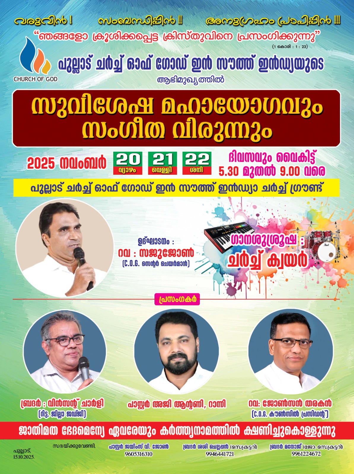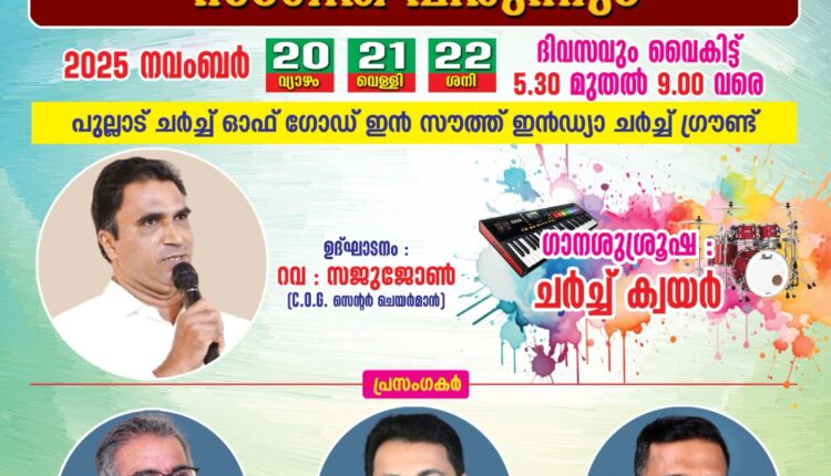 പുല്ലാട്: ചർച്ച് ഓഫ് ഗോഡ് ഇൻ സൗത്ത് ഇന്ത്യ പുല്ലാട് ഒരുക്കുന്ന സുവിശേഷ മഹായോഗവും സംഗീത വിരുന്നും നാളെ (നവംബർ 20,21,22) മുതൽ ശനിയാഴ്ച വരെ നടക്കും. സഭയുടെ മദ്ധ്യ മേഖല ചെയർമാൻ റവ. സജു ജോൺ ഉദ്ഘാടനം ചെയ്യും.