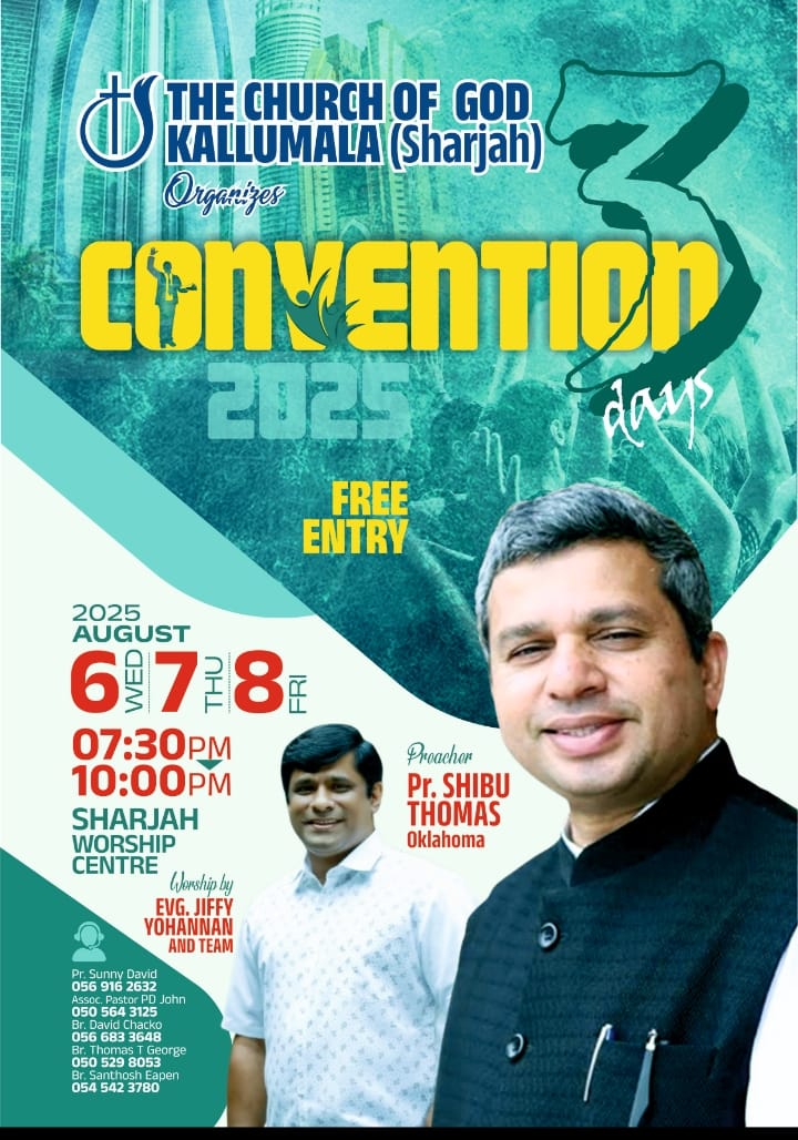 ഷാർജയിൽ ദി ചർച്ച് ഓഫ് ഗോഡ് കല്ലുമല കൺവെൻഷൻ ChristianNews Last updated Jun 16, 2025 743 ഷാർജ : ദി ചർച്ച് ഓഫ് ഗോഡ് കല്ലുമലയുടെ ആഭിമുഖ്യത്തിൽ ആഗസ്റ്റ് 6 മുതൽ 8 വരെ ഷാർജ വർഷിപ് സെന്ററിൽ കൺവെൻഷൻ നടക്കും. പാ. ഷിബു തോമസ് പ്രസംഗിക്കും. ഇവാ. ജിഫി യോഹന്നാൻ ആൻഡ് ടീം ഗാന ശുശ്രൂഷ നിർവഹിക്കും. പ്രവേശനം സൗജന്യമാണ്. 743 Share