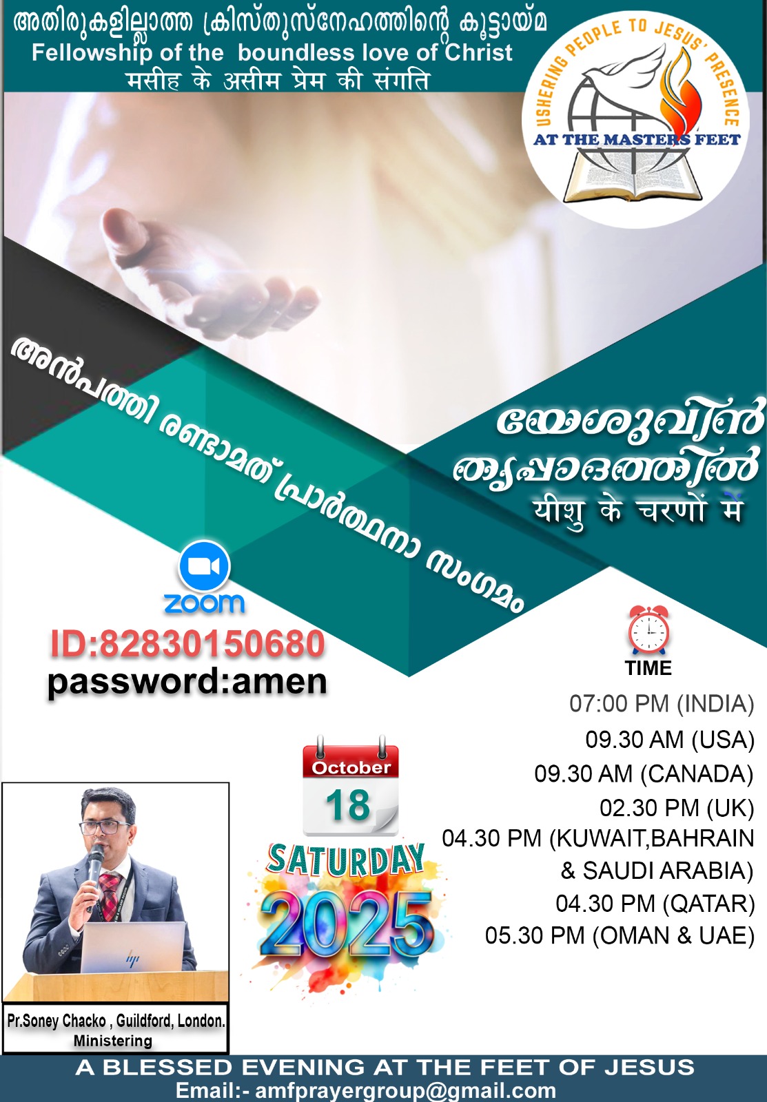ദൈവവചനം അതിരുകളില്ലാതെ എല്ലാവരിലേക്കും എത്തിക്കുക എന്ന ലക്ഷ്യത്തോടെ സംഘടിപ്പിക്കുന്ന ”യേശുവിൻ തൃപ്പാദത്തിൽ” അൻപത്തി രണ്ടാമത് പ്രാർത്ഥനാ സംഗമം ഒൿടോബർ 18 ന് ശനിയാഴ്ച രാത്രി 7.30ന് (ഇന്ത്യൻ സമയം) ഓൺലൈനിൽ നടക്കും.