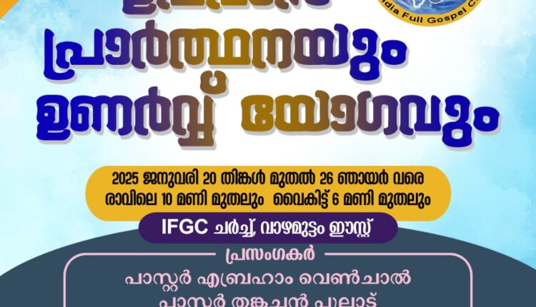 പത്തനംതിട്ട : ദി ഇന്ത്യ ഫുൾ ഗോസ്പൽ ചർച്ചിന്റെ ആഭിമുഖ്യത്തിൽ ജനുവരി 20 തിങ്കൾ മുതൽ 26 ഞായർ വരെ വാഴമുട്ടം ഈസ്റ്റ് ഐ എഫ് ജി സി ചർച്ചിൽ 7 ദിവസത്തെ ഉപവാസ പ്രാർത്ഥനയും ഉണർവ്വ് യോഗവും നടക്കും.