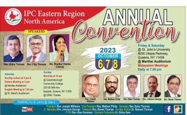 ന്യൂയോർക്ക്:ഐപിസി ഈസ്റ്റേൺ റീജിയൻ നോർത്ത് അമേരിക്കയുടെ വാർഷിക കൺവൻഷൻ ഇന്ന് ഒക്ടോ. 6 വെള്ളിയാഴ്ച്ച മുതൽ 8 ഞായർ വരെ നടക്കും. ഇന്ന് വൈകിട്ട് 7ന് റീജിയൻ പ്രസിഡന്റ് പാസ്റ്റർ ജോസഫ് വില്യംസ് ഉദ്ഘാടനം നിർവ്വഹിക്കും. പാസ്റ്റർ ഷിബു തോമസ് (ഒക്കലഹോമ) മുഖ്യപസംഗകനായിരിക്കും. ശനിയാഴ്ച പകൽ 2 ന് സണ്ടേസ്കൂളിന്റെയും ഉച്ച കഴിഞ്ഞ് 4 ന് സഹോദരിമാരുടെയും സമ്മേളനങ്ങൾ നടക്കും. സണ്ടേസ്കൂൾ റീജിയൻ തലത്തിൽ നടത്തിയ പരീക്ഷയിലെ വിജയികൾക്ക് സർട്ടിഫിക്കറ്റും സമ്മാനദാനവും നൽകും.