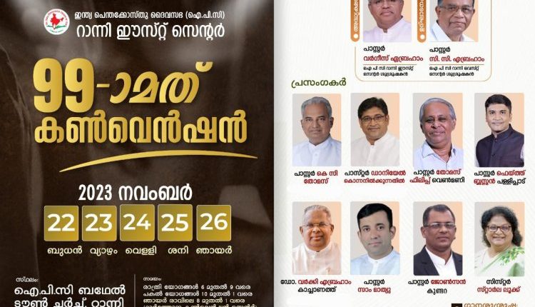 റാന്നി: ഐപിസി റാന്നി ഈസ്റ്റ് സെൻറർ 99-ാമത് കൺവെൻഷൻ നവംബർ 22 ഇന്നു മുതൽ 26 വരെ ഐപിസി ടൗൺ ചർച്ച് റാന്നിയിൽ നടക്കും. സെന്റർ ശുശ്രൂഷകൻ പാസ്റ്റർ വർഗീസ് എബ്രഹാം അധ്യക്ഷത വഹിക്കുന്ന സമ്മേളനം പാസ്റ്റർ സി.സി. എബ്രഹാം ഉദ്ഘാടനം നിർവഹിക്കും.