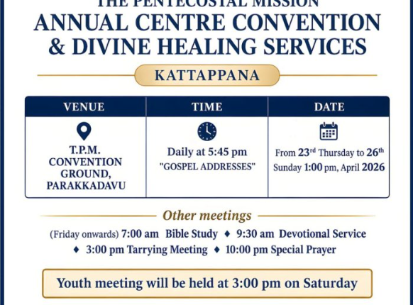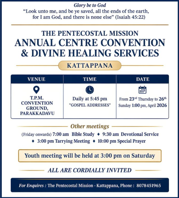കട്ടപ്പന: ദി പെന്തക്കോസ്ത് മിഷൻ കട്ടപ്പന സെന്റർ വാർഷിക കൺവെൻഷനും ദൈവിക രോഗശാന്തി ശുശ്രൂഷയും ഏപ്രിൽ 23 വ്യാഴാഴ്ച മുതൽ 26 ഞായറാഴ്ച വരെ ടി.പി.എം പാറാകടവ് കൺവെൻഷൻ ഗ്രൗണ്ടിൽ വെച്ച് നടക്കും. വെള്ളിയാഴ്ച മുതൽ എല്ലാ ദിവസവും രാവിലെ 7-ന് ബൈബിൾ ക്ലാസ്, 9.30-ന് പൊതുയോഗം, രാത്രി 10-ന് കാത്തിരിപ്പ് യോഗം എന്നിവ ഉണ്ടായിരിക്കും. ശനിയാഴ്ച ഉച്ചയ്ക്ക് 3-ന് യുവജന സമ്മേളനവും നടക്കും.