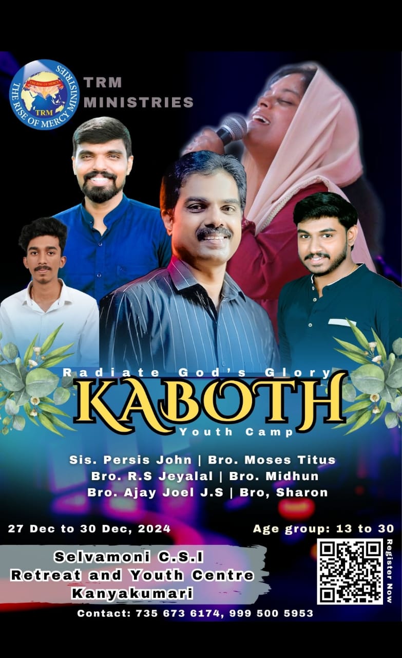 കന്യാകുമാരി : ദി റൈസ് ഓഫ് മേഴ്സി മിനിസ്ട്രിയുടെ ആഭിമുഖ്യത്തിൽ കന്യാകുമാരി സെൽവമണി സി.എസ്.ഐ. റിട്രീറ്റ് ആൻഡ് യൂത്ത് സെന്ററിൽ ഡിസംബർ 27 മുതൽ 30 വരെ യൂത്ത് ക്യാമ്പ് നടക്കും.