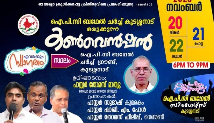 അടൂർ: ഐപിസി ബഥേൽ കുടശ്ശനാട് സഭയുടെ ആഭിമുഖ്യത്തിൽ നവം. 20 മുതൽ 22 വരെ ചർച്ച് ഗ്രൗണ്ടിൽ കൺവെൻഷൻ നടക്കും. തോമസ് മാത്യു ഉദ്ഘാടനം ചെയ്യും. പാസ്റ്റർമാരായ സുഭാഷ് കുമരകം, ഷാജി എം. പോൾ, തോമസ് ഫിലിപ്പ് എന്നിവർ പ്രസംഗിക്കും. പാസ്റ്റർ ആൻറണി ചാക്കോ, ബാബു ബ്ലെസ്സ് നഗർ, അനിയൻകുഞ്ഞ് എന്നിവർ നേതൃത്വം നൽകും.