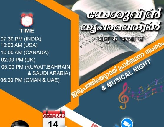 തിരുവല്ല: യേശുവിൻ തൃപ്പാദത്തിൽ ഇരുപത്തിയെട്ടാമത് പ്രാർത്ഥനാ സംഗമവും ഗാനസന്ധ്യയും ഒക്ടോബർ 14ന് ഇന്ത്യൻ സമയം രാത്രി 7.30-ന് ഓൺലൈനിൽ നടക്കും. പ്രസിദ്ധ ക്രൈസ്തവ ഗായകനായ പാസ്റ്റർ. സാംസൺ ജോണി നയിക്കുന്ന സംഗീത ശുശ്രൂഷയും, അനുഭവസാക്ഷ്യവും ഉണ്ടായിരിക്കും.