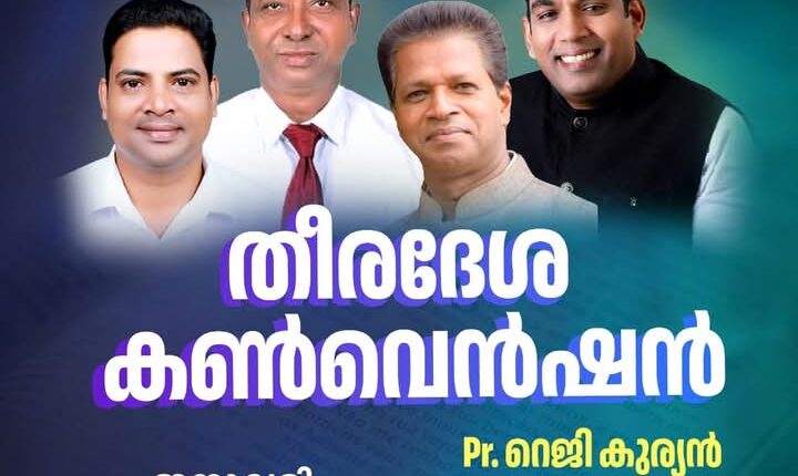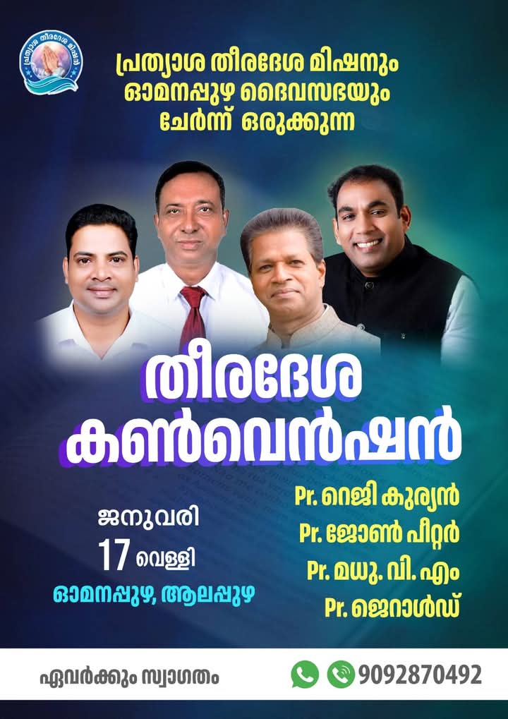 ആലപ്പുഴയിൽ തീരദേശ കൺവെൻഷൻ ChristianNews On Dec 7, 2024 60 ആലപ്പുഴ : പ്രത്യാശ തീരദേശ മിഷന്റെയും ഓമനപ്പുഴ ദൈവസഭയുടെയും സംയുക്ത ആഭിമുഖ്യത്തിൽ 2025 ജനുവരി 17 ന് ആലപ്പുഴ ഓമനപ്പുഴയിൽ തീരദേശ കൺവെൻഷൻ നടക്കും. പാ. ജോൺ പീറ്റർ, പാ. മധു വി എം, പാ. റെജി കുര്യൻ, പാ. ജെറാൾഡ് എന്നിവർ പ്രസംഗിക്കും. 60 Share