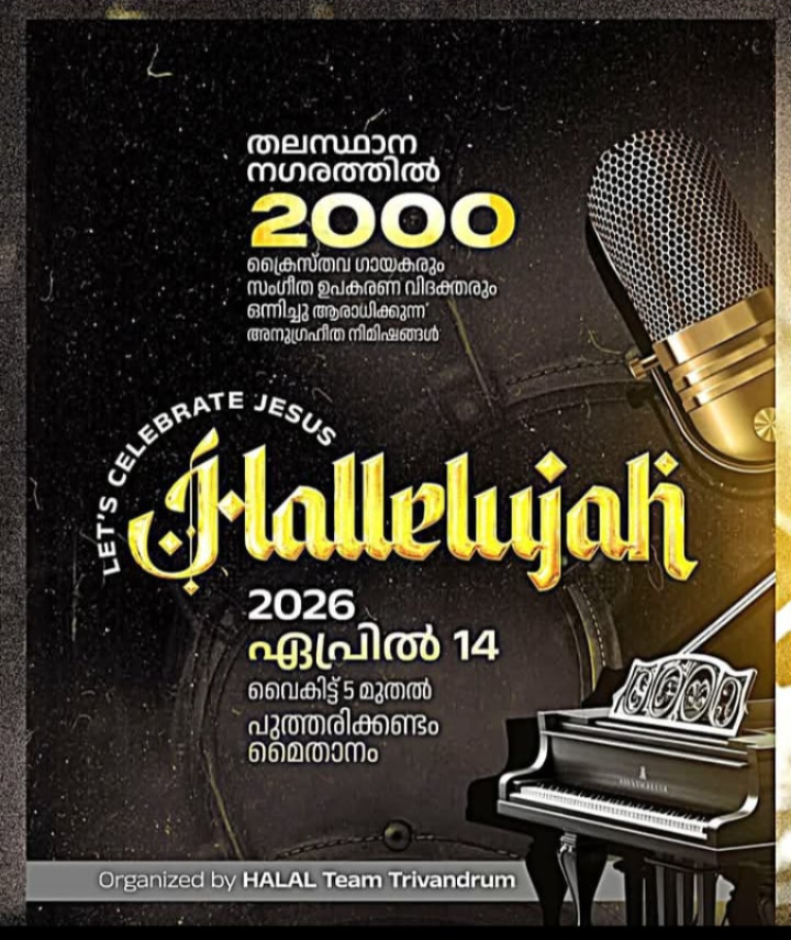 2026 ഏപ്രിൽ 14 ന് പുത്തരിക്കണ്ടം മൈതാനത്ത് തിരുവനന്തപുരം ഹലാൽ ടീം ഗാന സന്ധ്യ ChristianNews On Sep 8, 2025 690 തിരുവനന്തപുരം : തിരുവനന്തപുരം ഹലാൽ ടീമിന്റെ ആഭിമുഖ്യത്തിൽ 2026 ഏപ്രിൽ 14 ന് പുത്തരിക്കണ്ടം മൈതാനത്ത് ഗാന സന്ധ്യ നടക്കും. ക്രൈസ്തവ ഗായകരും സംഗീത ഉപകരണ വിദക്തരും ഉൾപ്പെടെ 2000 പേരാണ് പ്രോഗ്രാം നയിക്കുന്നത്. 690 Share