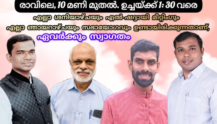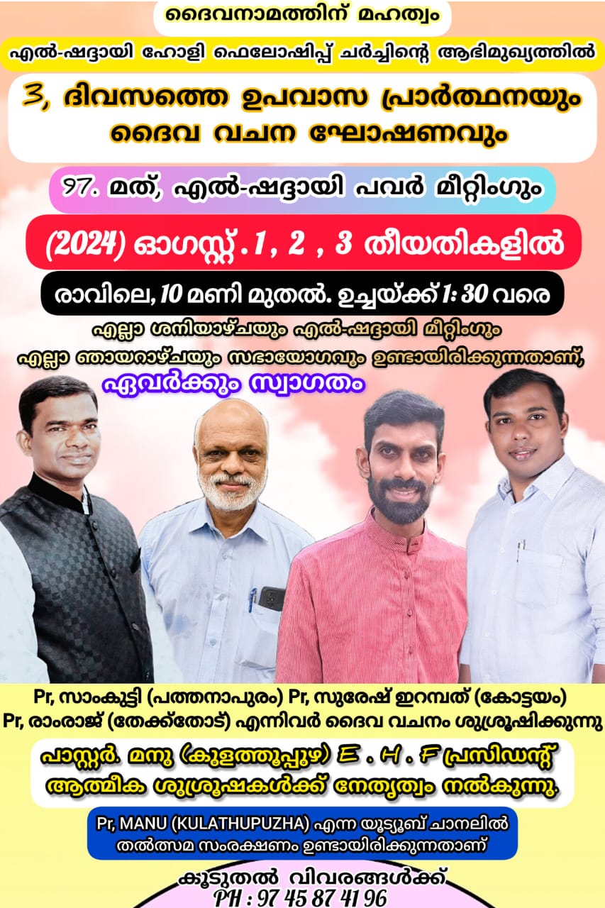 കൊട്ടാരക്കര : എൽ ഷദ്ദായി ഹോളി ഫെലോഷിപ്പ് ചർച്ചിൻ്റെ ആഭിമുഖ്യത്തിൽ ഓഗസ്റ്റ് 1 മുതൽ 3 വരെ തൃക്കണ്ണമംഗൽ ജംഗ്ഷനിൽ 3 ദിവസത്തെ ഉപവാസ പ്രാർത്ഥനയും ശനിയാഴ്ച 97 മത് – എൽ-ഷദ്ദായി പവർ മീറ്റിംഗും നടക്കും. പാ രാംരാജ്, പാ സാം കുട്ടി, പാ സുരേഷ് ഇറമ്പത്ത് എന്നിവർ പ്രസംഗിക്കും, പാ മനു നേതൃത്വം നൽകും.
