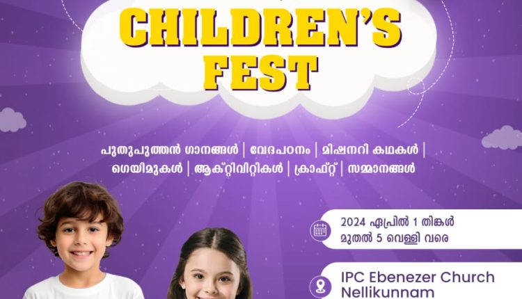 കൊട്ടാരക്കര : ഐപിസി എബനേസർ നെല്ലിക്കുന്നം സഭയുടെ നേതൃത്വത്തിൽ Timothy children’s fest ഏപ്രിൽ 1 മുതൽ 5 വരെ എല്ലാ ദിവസവും രാവിലെ 8:30 മുതൽ 12 :30 വരെ നെല്ലിക്കുന്നം ഐപിസി എബനേസർ സഭയിൽ വച്ച് നടക്കും. കുട്ടികൾക്കായി സ്കിറ്റുകൾ, പാട്ടുകൾ, ആക്റ്റിവിറ്റുകൾ, സോങ്ങുകൾ, പപ്പറ്റ് ഷോ, മാജിക്ക്ഷോ, റാലി, സ്നേഹവിരുന്ന്ആ, കർഷകമായ സമ്മാനങ്ങൾ എന്നിവ children’s festന്റെ
