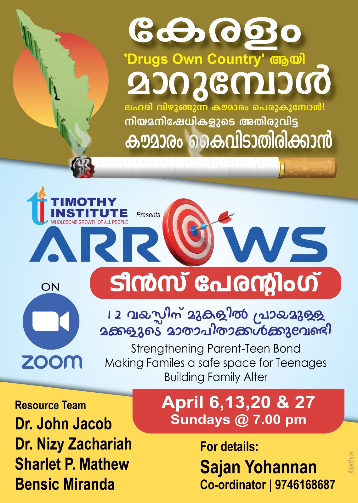 ഇന്നിന്റെ സാഹചര്യങ്ങളിൽ നമുടെ കൗമാരക്കാർ നേരിടുന്ന പ്രശ്നങ്ങളെ മനസിലാക്കി കൗമാരക്കാരുടെ മാതാപിതാക്കൾക്ക് മാർഗനിർദ്ദേശവും ഡിജിറ്റൽ കാലഘട്ടത്തിൽ മാതാപിതാക്കമാർ അറിഞ്ഞിരിക്കേണ്ട വിവിധ വിഷയങ്ങളും ഈ ക്ലാസുകളിൽ ചർച്ച ചെയ്യും. തലമുറകളെ ആത്മീയരായി വളർത്തു വാൻ ആഗ്രഹിക്കുന്ന എല്ലാ മാതാപിതാക്കന്മാരും അറിഞ്ഞിരിക്കേണ്ട വിഷയങ്ങളാണ് ഈ ക്ലാസുകളിൽ ഉൾപ്പെടുത്തിയിരിക്കുന്നത്. 12 വയസിനു മുകളിൽ പ്രായമുള്ള മക്കളുള്ള മാതാപിതാക്കന്മാർക്കായി പ്രത്യേകം തയ്യാർ ചെയ്തിരിക്കുന്ന ഈ പ്രോഗ്രാമിൽ പങ്കെടുക്കുവാൻ ആഗ്രഹിക്കുന്നവർ മുൻ കൂട്ടി പേര് രജിസ്റ്റർ ചെയ്യേണ്ടതാണ്. രജിസ്ടേഷൻ തികച്ചും സൗജന്യമാണ്. രജിസ്റ്റർ ചെയ്യുന്നവർക്ക് സൂം ID നേരിട്ട് അയച്ചു തരുന്നതായിരിക്കും.