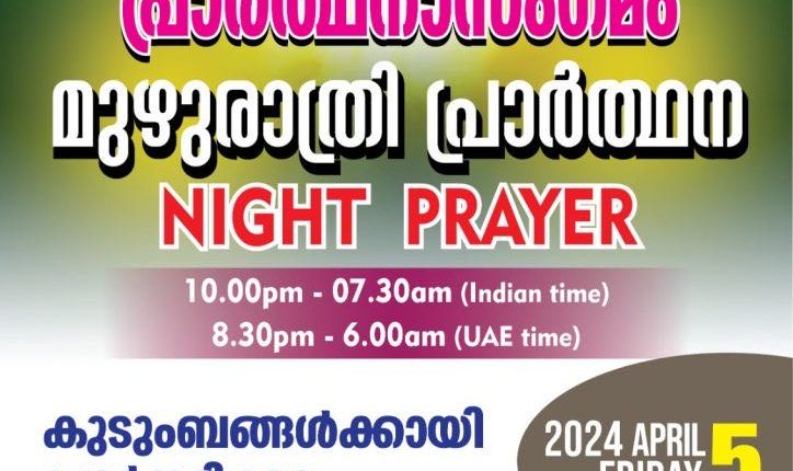 ഷാർജ : പ്രാർത്ഥന സംഗമം ഒരുക്കുന്ന മുഴുരാത്രി പ്രാർത്ഥന രാത്രി 8 : 30 മുതൽ 6 മണിവരെ (യു എ ഇ സമയം )നടക്കും. രാജ്യങ്ങൾക്കു വേണ്ടിയും കുടുംബങ്ങൾക്കുവേണ്ടിയും ,തലമുറകൾക്കുവേണ്ടിയും , മറ്റുള്ളവരുടെ വിഷയങ്ങൾക്കുവേണ്ടിയും , ഭാരതത്തിനുവേണ്ടിയും ഉള്ള പ്രാർത്ഥനകൾക്ക് പാസ്റ്റർ കെ.പി. ജോസ് വേങ്ങൂർ നേതൃത്വം നൽകും. സൂം മീറ്റിങ് ID 332 242 5551 പാസ് കോഡ് : 2020