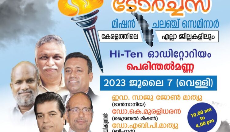 ടോർച്ച സ് മിഷൻ ചലഞ്ച് സെമിനാർ News On Jun 21, 2023 206 പെരിന്തൽമണ്ണ: വടക്കേന്ത്യൻ മിഷണറിമാരുടെ ഹൃദയസ്പർശിയായ അനുഭവങ്ങൾ വിശദികരിക്കുന്ന ടോർച്ച സ് മിഷൻ ചലഞ്ച് സെമിനാർ ജൂലൈ 7 ന് കേരളത്തിലെ എല്ലാ ജില്ലകളിലും നടക്കുന്നു. 206 Share