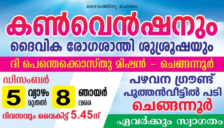 ചെങ്ങന്നൂർ: ദി പെന്തെക്കോസ്ത് മിഷൻ തിരുവല്ല സെന്ററിലെ ചെങ്ങന്നൂർ പ്രാദേശിക സഭയുടെ വാർഷിക കൺവൻഷനും ദൈവീക രോഗശാന്തി ശുശ്രൂഷയും ഡിസംബർ 5 മുതൽ 8 വരെ പുത്തൻവീട്ടിൽപടി പഴവന ഗ്രൗണ്ടിൽ നടക്കും. സഭയിലെ വിവിധ ശുശ്രൂഷകർ പ്രസംഗിക്കും. മിഷൻ പ്രവർത്തകർ കൺവെൻഷൻ ഗാനങ്ങൾ ആലപിക്കും.