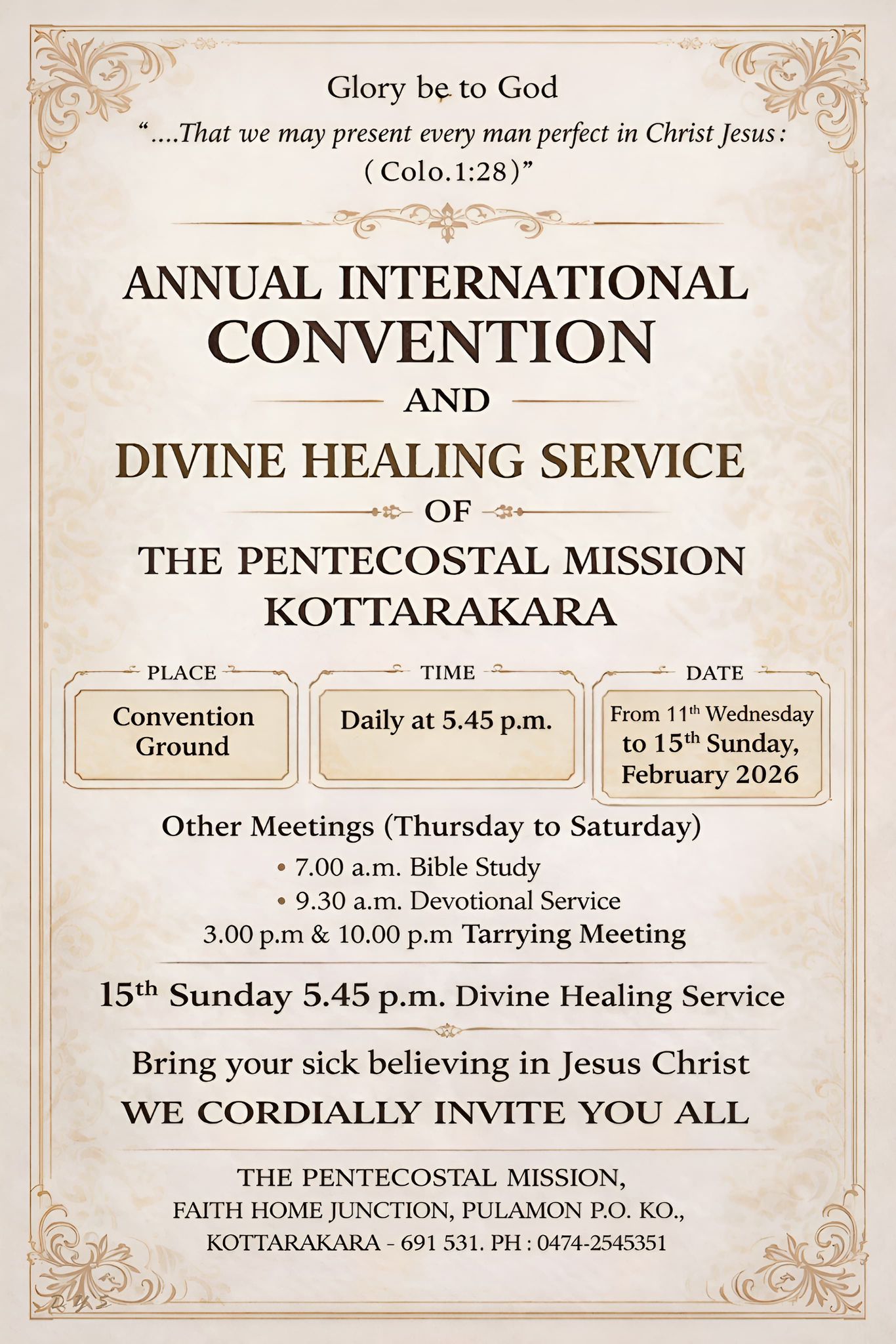 കൊട്ടാരക്കര: ദി പെന്തെക്കൊസ്ത് മിഷൻ കൊട്ടാരക്കര സാർവ്വദേശീയ കണ്വൻഷനും ദൈവിക രോഗശാന്തി ശുശ്രൂഷയും ഫെബ്രുവരി 11 ബുധൻ മുതൽ 15 ഞായർ വരെ പുലമൺ ഫെയ്ത്ത് ഹോം ജംഗ്ഷൻ റ്റി.പി.എം കൺവൻഷൻ ഗ്രൗണ്ടിൽ നടക്കും.