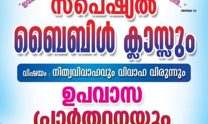 14, 15, 16 തീയതികളിൽ വൈകിട്ട് 5.45 ന് ‘നിത്യവിവാഹവും വിവാഹ വിരുന്നും’ എന്ന വിഷയത്തെ ആസ്പദമാക്കി സ്പെഷ്യൽ ബൈബിൾ ക്ലാസ്സും ചൊവ്വ, ബുധൻ ദിവസങ്ങളിൽ രാവിലെ 9.30 ന് ഉപവാസ പ്രാർത്ഥനയും നടക്കും. സഭയുടെ സീനിയർ ശുശ്രൂഷകർ യോഗങ്ങൾക്ക് നേതൃത്വം നൽകും.