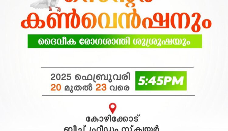 കോഴിക്കോട്: ദി പെന്തെക്കൊസ്ത് മിഷൻ കോഴിക്കോട് സെന്റർ വാർഷിക കൺവൻഷൻ ഇന്ന് ഫെബ്രുവരി 20 വ്യാഴം മുതൽ 23 ഞായർ വരെ കോഴിക്കോട് ബീച്ച് ഫ്രീഡം സ്ക്വയറിൽ നടക്കും.