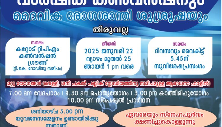 തിരുവല്ല: ദി പെന്തെക്കോസ്ത് മിഷൻ തിരുവല്ല സെന്റർ വാർഷിക കൺവെൻഷനും ദൈവീകരോഗശാന്തി ശുശ്രൂഷയും ജനുവരി 22 വ്യാഴം മുതൽ 25 ഞായർ വരെ റ്റി.കെ.റോഡിന് സമീപം കറ്റോട് റ്റി.പി.എം കൺവെൻഷൻ ഗ്രൗണ്ടിൽ നടക്കും. ദിവസവും രാവിലെ 7-ന് ബൈബിൾ ക്ലാസ് ,9.30 ന് പൊതുയോഗം, മൂന്നിന് കാത്തിരിപ്പ് യോഗം, വൈകിട്ട് 5.45 ന് ഗാനശുശ്രൂഷ, സുവിശേഷ പ്രസംഗം, രോഗശാന്തി ശുശ്രൂഷ രാത്രി 10 ന് പ്രത്യേക പ്രാർഥന എന്നിവയും ശനിയാഴ്ച ഉച്ചയ്ക്ക് 3 ന് പ്രത്യേക യുവജന മീറ്റിംങ്ങ് ഉണ്ടായിരിക്കും. വെള്ളി ,ശനി പകൽ യോഗങ്ങൾ തിരുവല്ല പബ്ലിക് സ്റ്റേഡിയത്തിന് സമീപമുള്ള ടി പി എം ആരാധനാ ഹാളിൽ നടക്കും. സമാപന ദിവസമായ ഞായറാഴ്ച രാവിലെ 9 ന് തിരുവല്ല സെന്ററിന് കീഴിലുള്ള 33 പ്രാദേശിക സഭകളിലെ ശുശ്രൂഷകരും വിശ്വാസികളും പങ്കെടുക്കുന്ന സംയുക്ത സഭായോഗത്തോടെ കൺവൻഷൻ സമാപിക്കും.