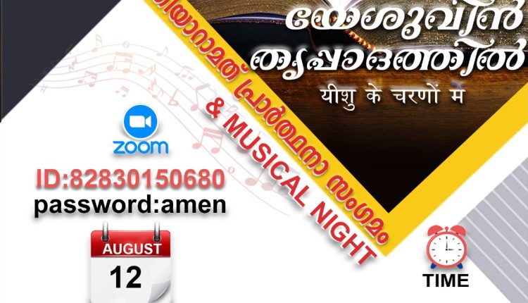 അതിരുകളില്ലാത്ത ദൈവവചനത്തിലൂടെ ദൈവസ്നേഹം അതിർവരമ്പുകളില്ലാതെ തന്നെ എല്ലാവരിലേക്കും എത്തിക്കുക എന്ന ലക്ഷ്യത്തോടെ ”യേശുവിൻ തൃപ്പാദത്തിൽ” ഇരുപത്തിആറാമത് പ്രാർത്ഥനാ സംഗമവും ഗാനസന്ധ്യയും 2023 ആഗസ്റ്റ് 12ന് ഇന്ത്യൻ സമയം രാത്രി 7.30-ന് ഓൺലൈനിൽ നടക്കും. പ്രസിദ്ധ ക്രൈസ്തവ ഗായകനായ പാസ്റ്റർ.ചാർലി സാം ബാബു(കാനഡ) നയിക്കുന്ന സംഗീത ശുശ്രൂഷയും,തൻറെ അനുഭവസാക്ഷ്യവും ഉണ്ടായിരിക്കും. ID : 828 3015 0680 Password :amen
