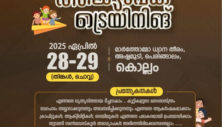 ദ്വിദിന സൺഡേ സ്കൂൾ ടീച്ചേഴ്സ് ട്രെയിനിങ് ഏപ്രിൽ 28, 29 ദിവസങ്ങളിൽ കൊല്ലം അഷ്ടമുടി പെരിങ്ങാലം മാർത്തോമ്മ ധ്യാനതീരത്ത് നടക്കും.