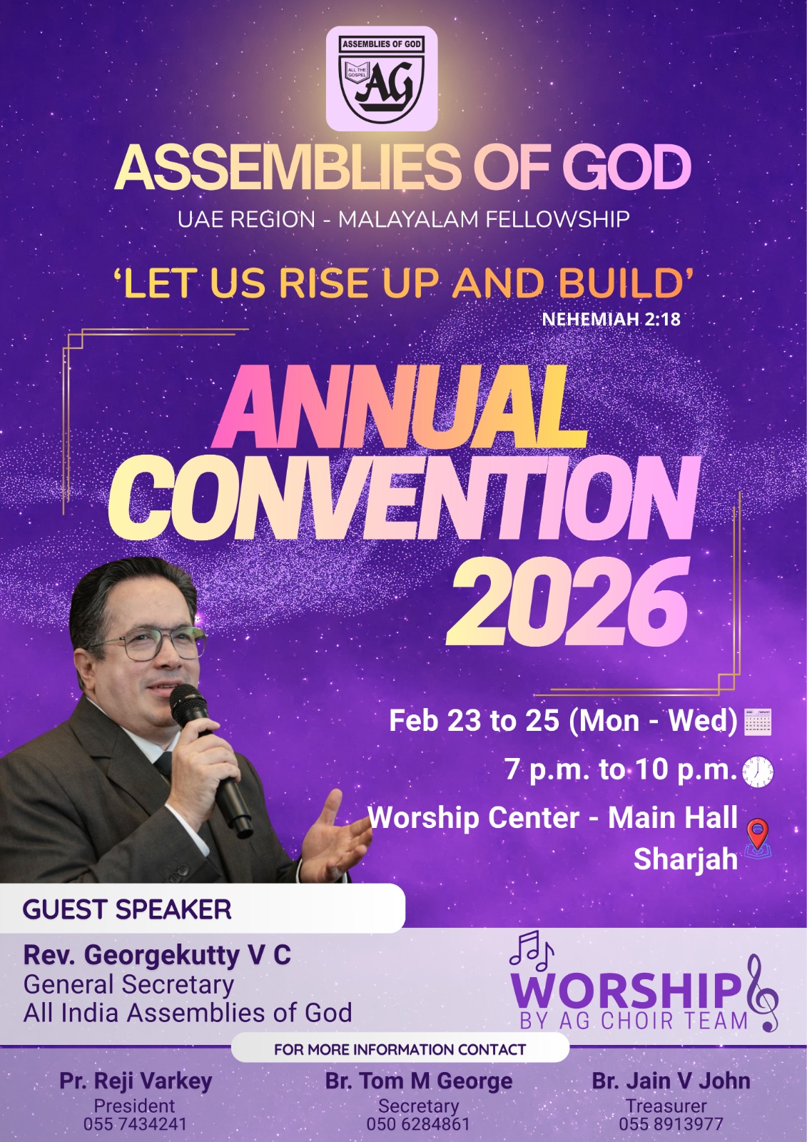എ.ജി യു.എ.ഇ റീജിയൻ മലയാളം ഫെലോഷിപ്പ് ആനുവൽ കൺവെൻഷൻ 23 മുതൽ ChristianNews On Feb 13, 2026 463 യുഎഇ : അസംബ്ലീസ് ഗോഡ് യുഎഇ റീജിയൻ മലയാളം ഫെലോഷിപ്പിന്റെ ആഭിമുഖ്യത്തിൽ ഈ മാസം 23 മുതൽ 25 വരെ ഷാർജ വർഷിപ് സെന്റർ മെയിൻ ഹാളിൽ ആനുവൽ കൺവെൻഷൻ നടക്കും. റവ. ജോർജ്കുട്ടി വി സി പ്രസംഗിക്കും. എജി കൊയർ ടീം ഗാന ശുശ്രൂഷ നിർവഹിക്കും. 463 Share