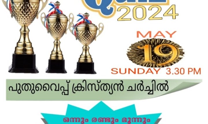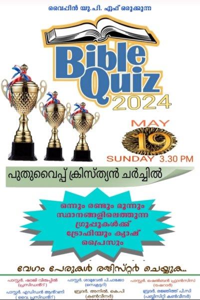വൈപ്പിൻ : പുതുവൈപ്പ് ക്രിസ്ത്യൻ ചർച്ചിൽ ഇന്ന് ഉച്ചകഴിഞ്ഞ് 3 .30 ന് യുണൈറ്റഡ് പെന്തക്കോസ്ത് ഫെലോഷിപ്പിൻ്റെ (യുപിഎഫ് ) ആഭിമുഖ്യത്തിൽ ബൈബിൾ ക്വിസ് മത്സരം നടത്തുന്നു.