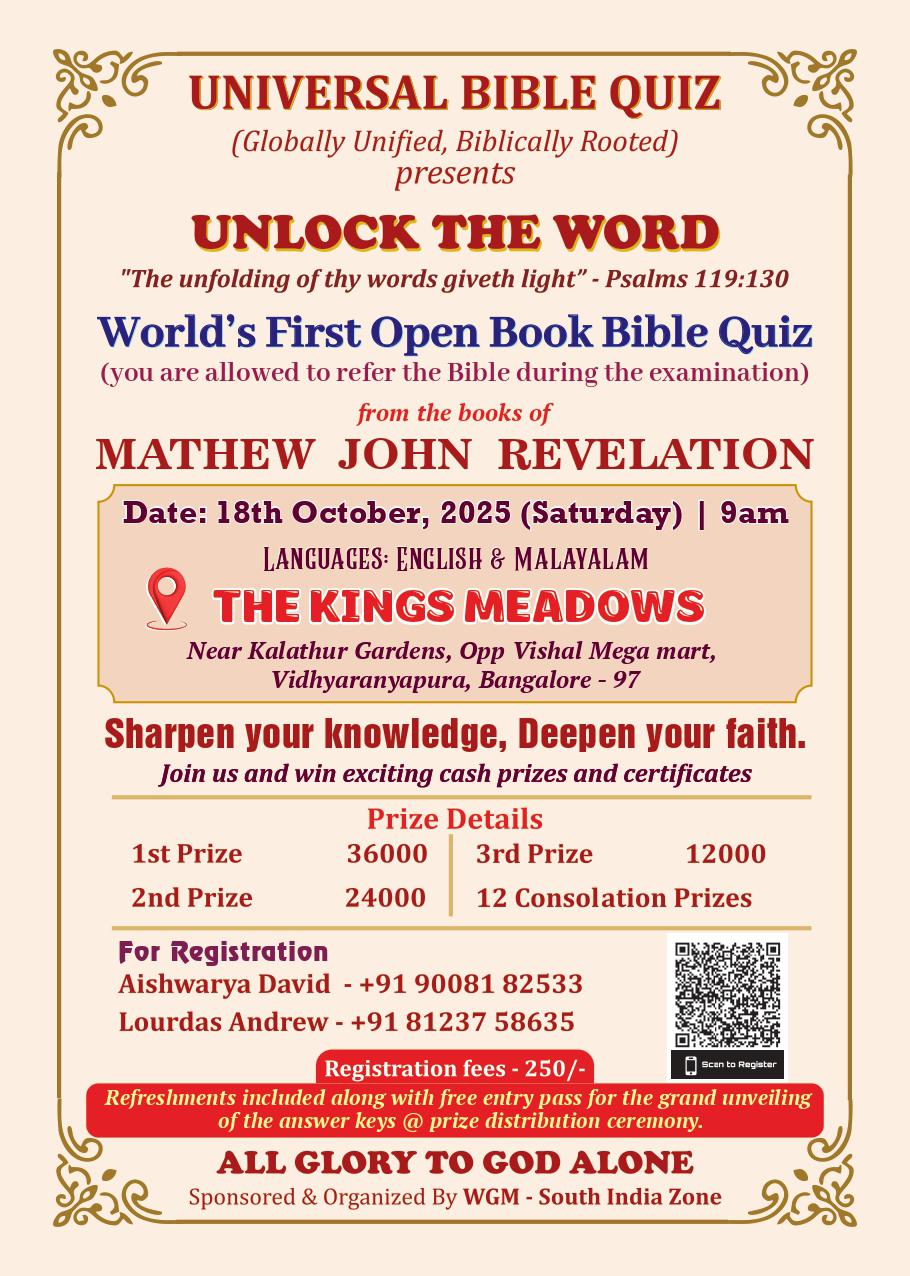 ബെംഗളൂരു: വേൾഡ് ഗോസ്പൽ മിഷൻ ദക്ഷിണേന്ത്യൻ മേഖലയുടെ നേതൃത്വത്തിൽ ഒക്ടോബർ 18 ശനി രാവിലെ 9 ന് വിദ്യാരണ്യപുര എം.എസ് പാളയ, കളത്തൂർ ഗാർഡൻസിന് സമീപം ദി കിങ്ങ്സ് മിഡോസ് ഹാളിൽ യൂണിവേഴ്സൽ ബൈബിൾ ക്വിസ് നടക്കും.