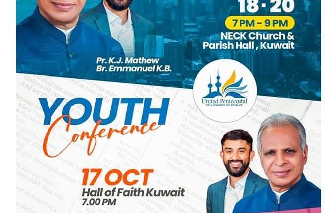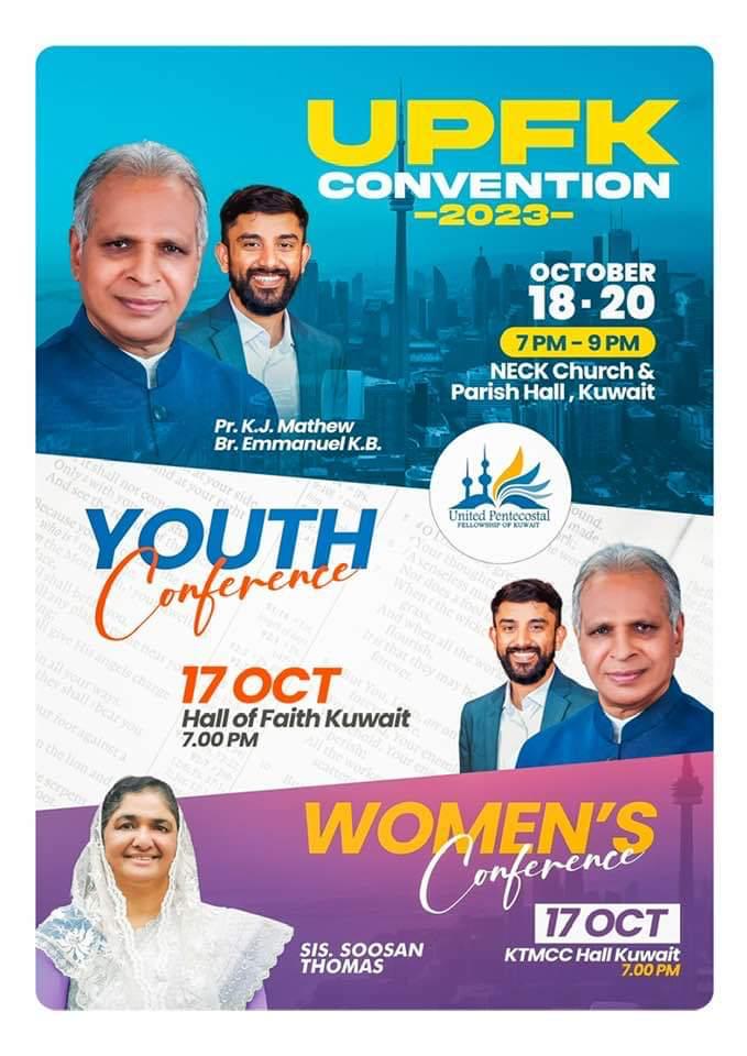 കുവൈറ്റ് സിറ്റി: യുണൈറ്റഡ് പെന്തെക്കോസ്റ്റൽ ഫെല്ലോഷിപ്പ് ഓഫ് കുവൈറ്റ് (യു.പി.എഫ്.കെ) ഐക്യ കൺവെൻഷൻ ഒക്ടോബർ 17 ചൊവ്വ മുതൽ 20 വെള്ളി വരെ എല്ലാ ദിവസവും വൈകിട്ട് 7 മണി മുതൽ 9 മണി വരെ നാഷണൽ ഇവാൻജെലിക്കൽ ചർച്ച് കോമ്പൗണ്ടിലുള്ള (എൻ ഇ സി കെ) ചർച്ച് & പാരിഷ് ഹാളിൽ നടക്കും.