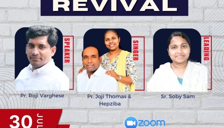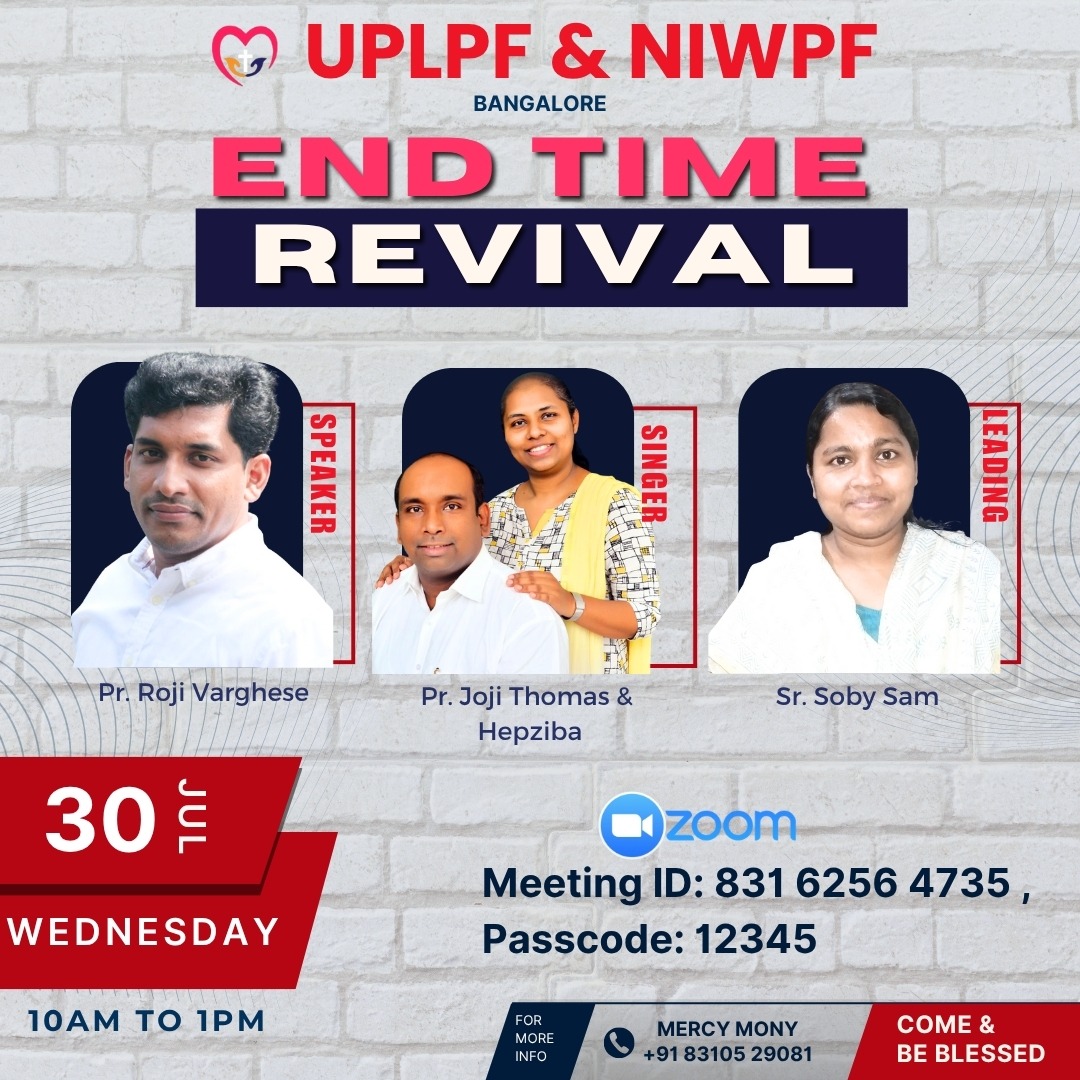 ബാംഗ്ലൂർ : യു പി എൽ പി എഫ് & എൻ ഐ ഡബ്ലിയു പി എഫ് ബാംഗ്ലൂരിന്റെ ആഭിമുഖ്യത്തിൽ നാളെ (ജൂലൈ 30) രാവിലെ 10 മുതൽ ഉച്ചയ്ക്ക് 1 വരെ ഓൺലൈനിൽ റിവൈവൽ മീറ്റിംഗ് നടക്കും. പാ. റോജി വർഗീസ് പ്രസംഗിക്കും. സിസ്റ്റർ സോബി സാം നേതൃത്വം നൽകും. പാ. ജോജി തോമസ് & ഹെപ്സിബ എന്നിവർ ഗാന ശുശ്രൂഷ നിർവഹിക്കും.